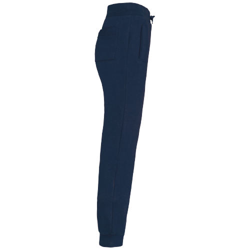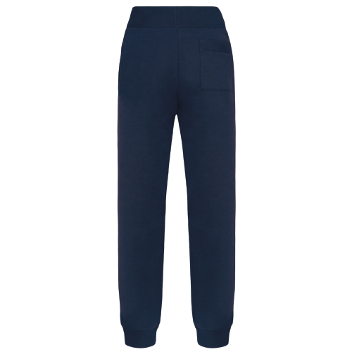 80% coton peigné / 20% polyester. Molleton gratté. 2 poches côtés et 1 poche arrière plaquée. Large bord-côte et lien de serrage à la taille. Finition bord-côte bas de jambe. Blason tissé.